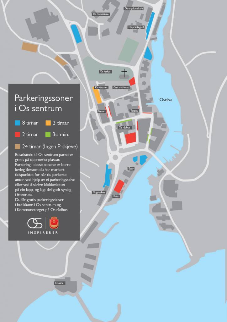 Det er gratis for besøkande å parkere i Os Sentrum på merka plassar. I Os Sentrum finn du 30 minutts, 2-, 3- og 8-timars parkering. Sjå kartet med oversikt over dei ulike parkeringssonene.
